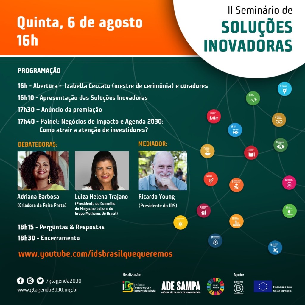 As 10 iniciativas foram selecionadas a partir de chamada pública que recebeu cerca de 100 inscrições entre 4 de maio e 4 de junho. Agora, os idealizadores de cada projeto irão contar individualmente suas trajetórias, resultados e impactos positivos, nas áreas em que atuam. O painel Negócios de impacto e Agenda 2030: Como atrair a atenção de investidores? vai reunir a empresária Luiza Helena Trajano, presidente do Conselho do Magazine Luiza e do Grupo Mulheres do Brasil; o empresário e ambientalista Ricardo Young, presidente do IDS; e Adriana Barbosa, criadora da Feira Preta, maior evento de cultura e empreendedorismo negro da América Latina. Juntos, eles vão falar sobre negócios de impacto e os Objetivos de Desenvolvimento Sustentável (ODS), abordando como essas iniciativas podem atrair a atenção de investidores contribuindo para a recuperação econômica pós-pandemia.