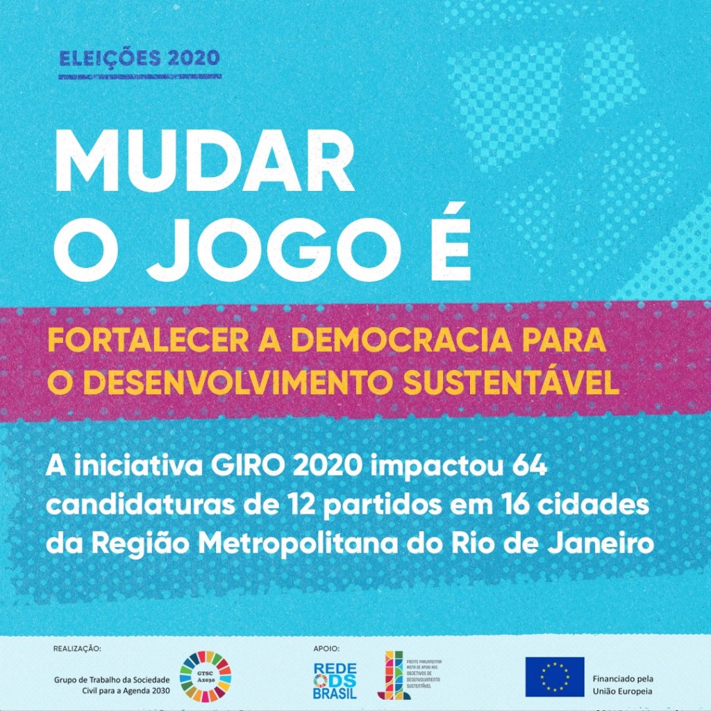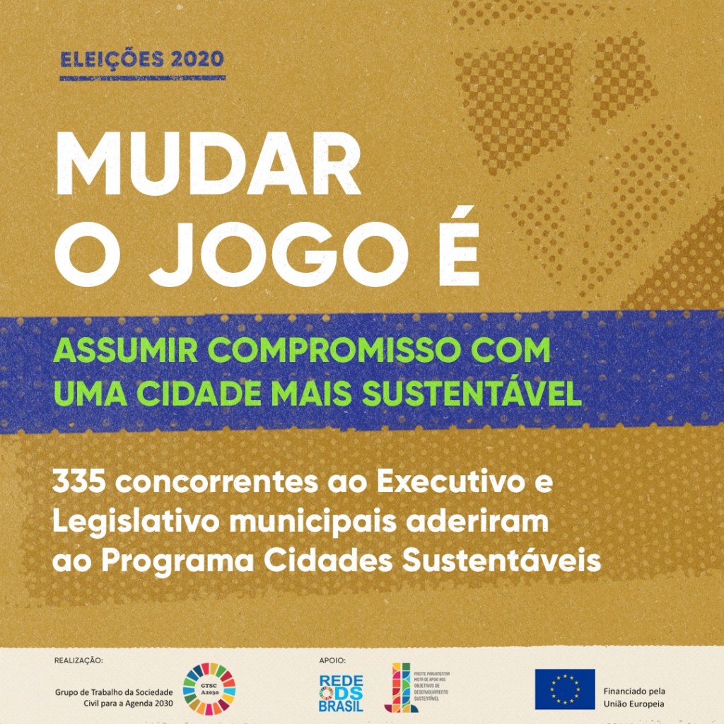 A campanha Mudar o jogo – Agenda 2030 e as Eleições Municipais foi lançada no dia 19 de outubro pelo GT Agenda 2030, em parceria com a Frente Parlamentar Mista de Apoio aos ODS e com a Rede ODS Brasil, com apoio financeiro da União Europeia. Seu objetivo foi divulgar os ODS e fazer com que candidaturas ao Executivo e ao Legislativo municipais e eleitores/as se comprometessem com a ideia de que é possível mudar o mundo para melhor.