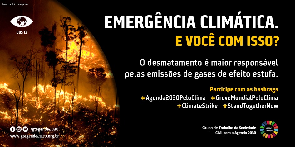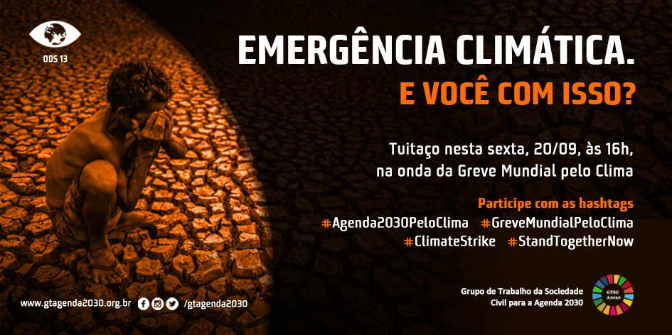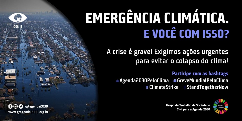 O Grupo de Trabalho da Sociedade Civil para a Agenda 2030 (GT Agenda 2030), coalizão formada por mais de 40 ONGs, movimentos sociais, fóruns e fundações brasileiras responsável pela difusão, promoção e monitoramento da implementação dos Objetivos de Desenvolvimento Sustentável (ODS) no Brasil, decidiu se engajar na Mobilização Global pelo Clima ou Greve Global pelo Clima, que acontece de 20 a 27 de setembro de 2019.