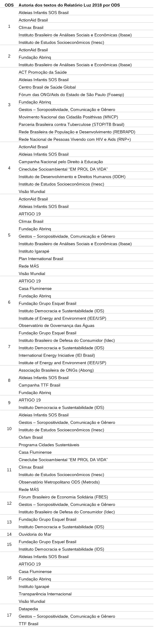 Os textos do segundo Relatório Luz do GT da sociedade civil para a Agenda 2030 foram resultado de um trabalho coletivo de várias pessoas, de várias organizações da sociedade civil brasileira. Confira a lista de organizações envolvidas nos vários capítulos, por cada ODS: